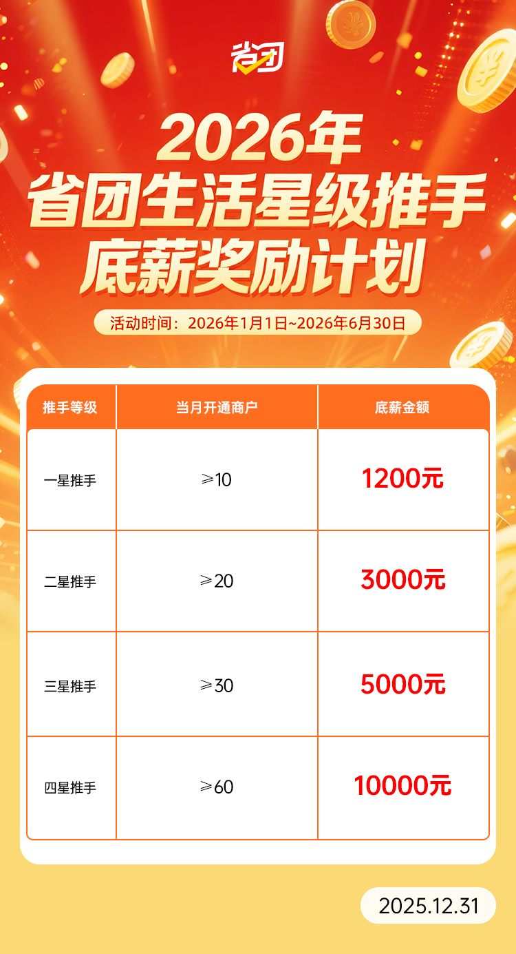 重磅消息:省团生活2026年POS机底薪计划开始啦!!!一星推手: >=10 底薪 1200元二星推手: >=20 底薪 3000元三星推手: >=30 底薪 5000元四星推手: >=60 底薪 10000元想要敢要你就来: